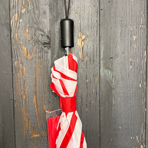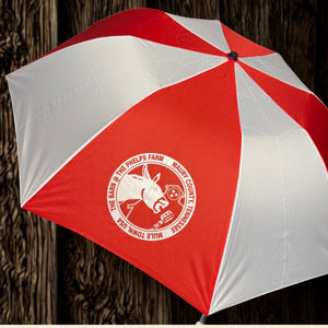 Rain or shine, this umbrella brings the barn with you. Featuring the iconic Singing Mule logo from The Barn @ The Phelps Farm in MuleTown, USA, this custom red and white umbrella is equal parts practical and playful.