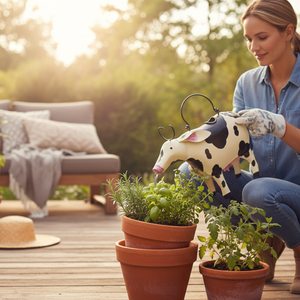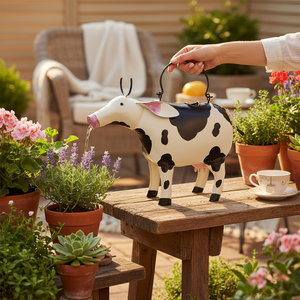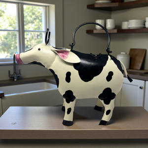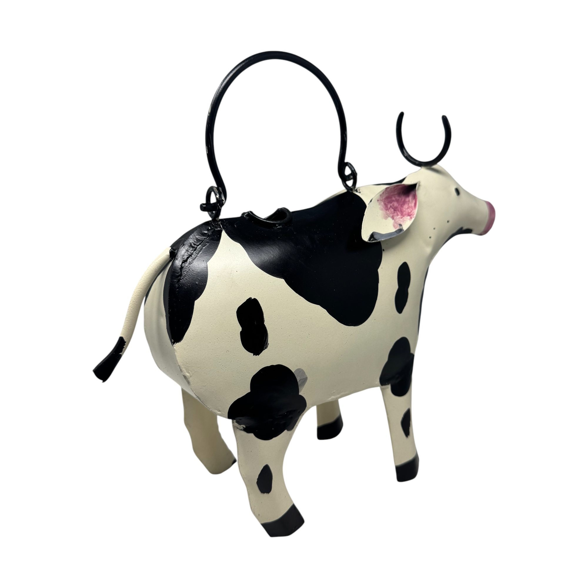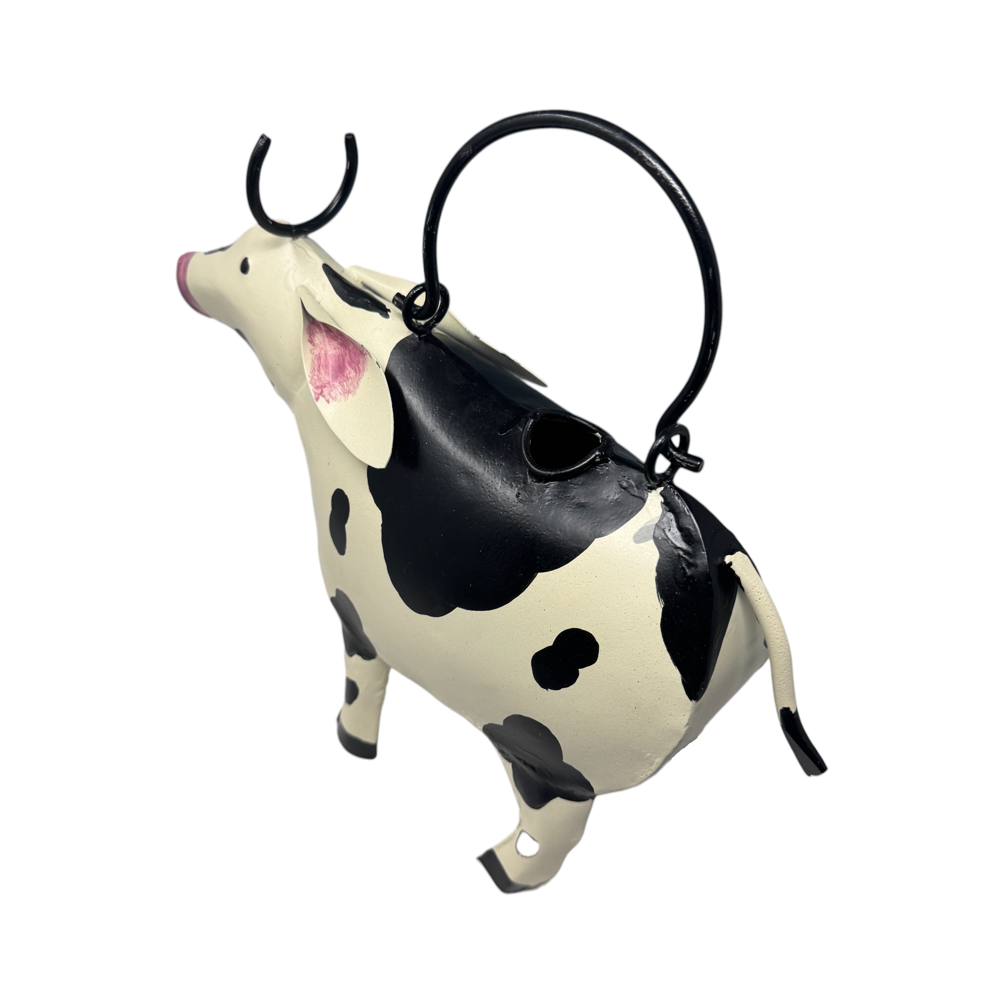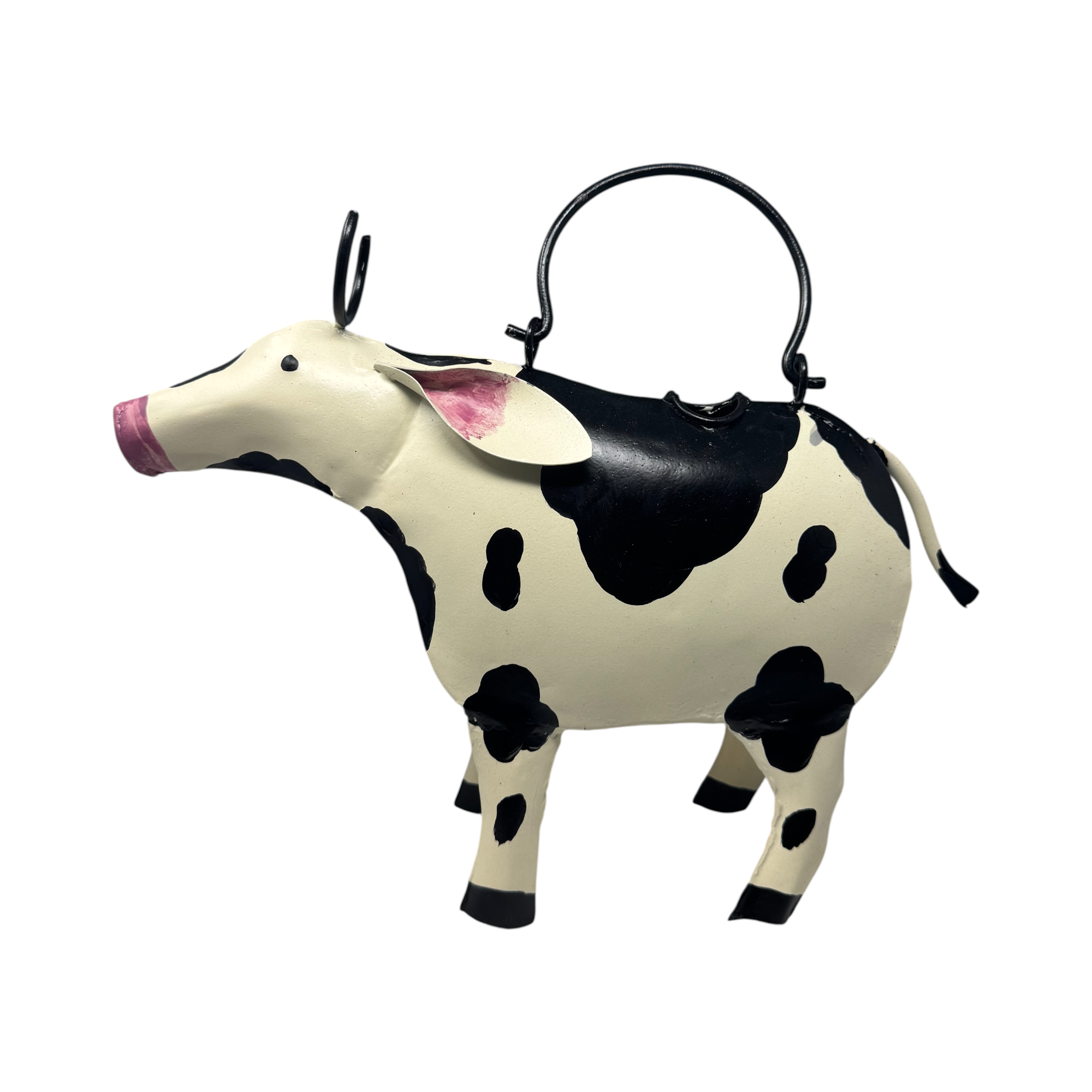 Made from upcycled metal and hand-painted in classic cream and black with a rosy pink nose, this dairy cow is full of personality. A fill hole on her back allows you to easily add water, which then pours gently from her nose to water your plants.